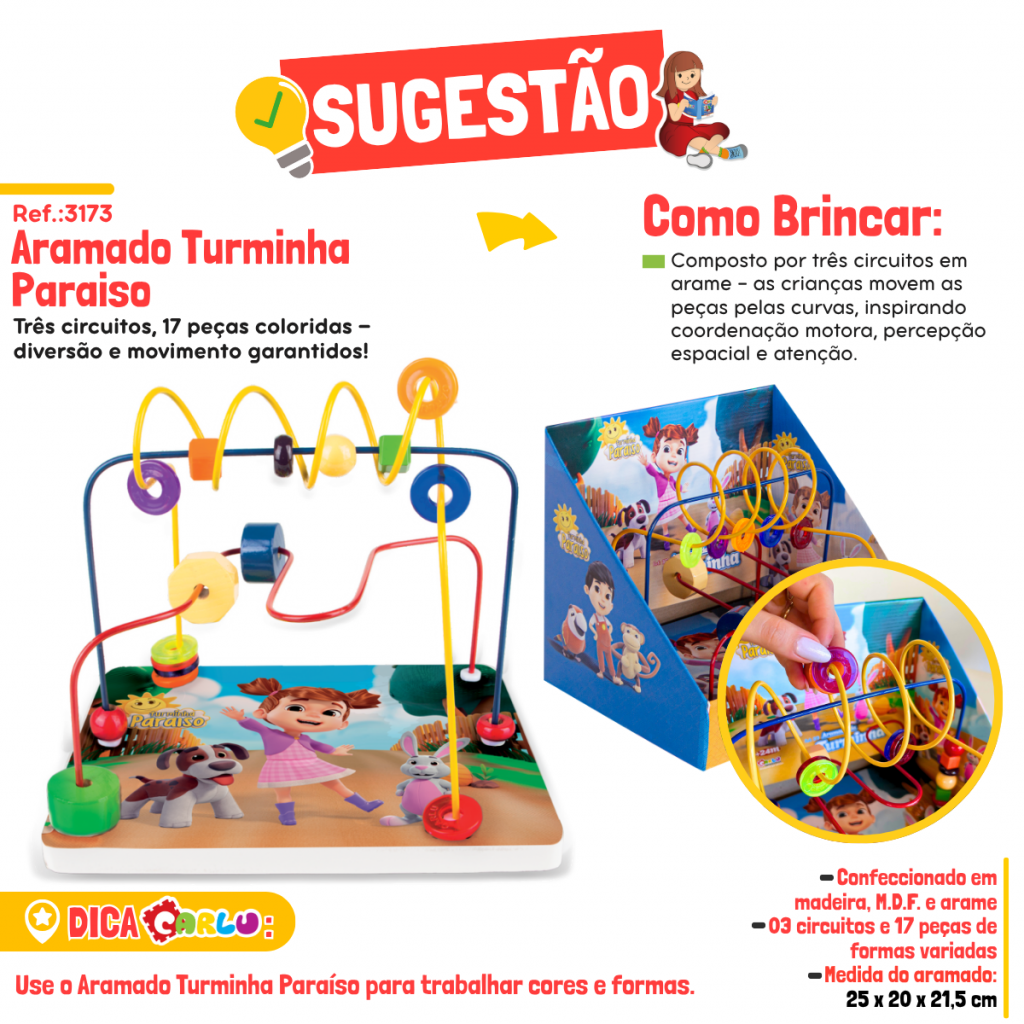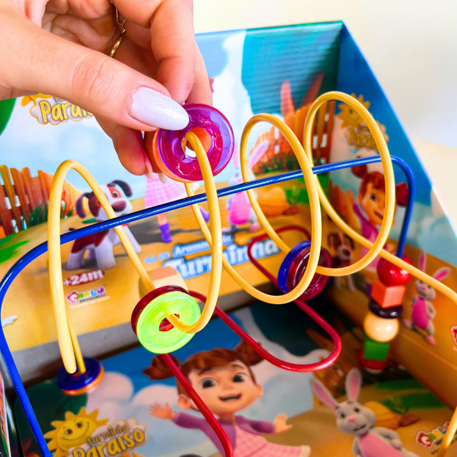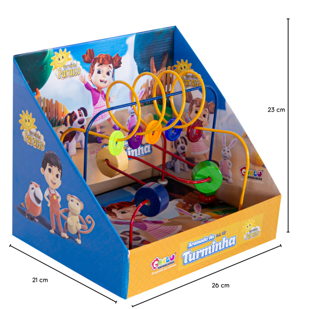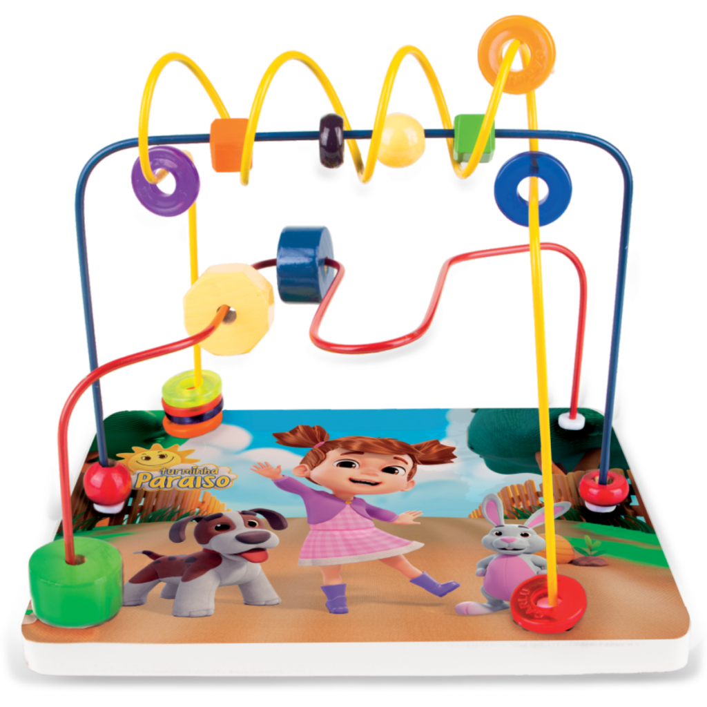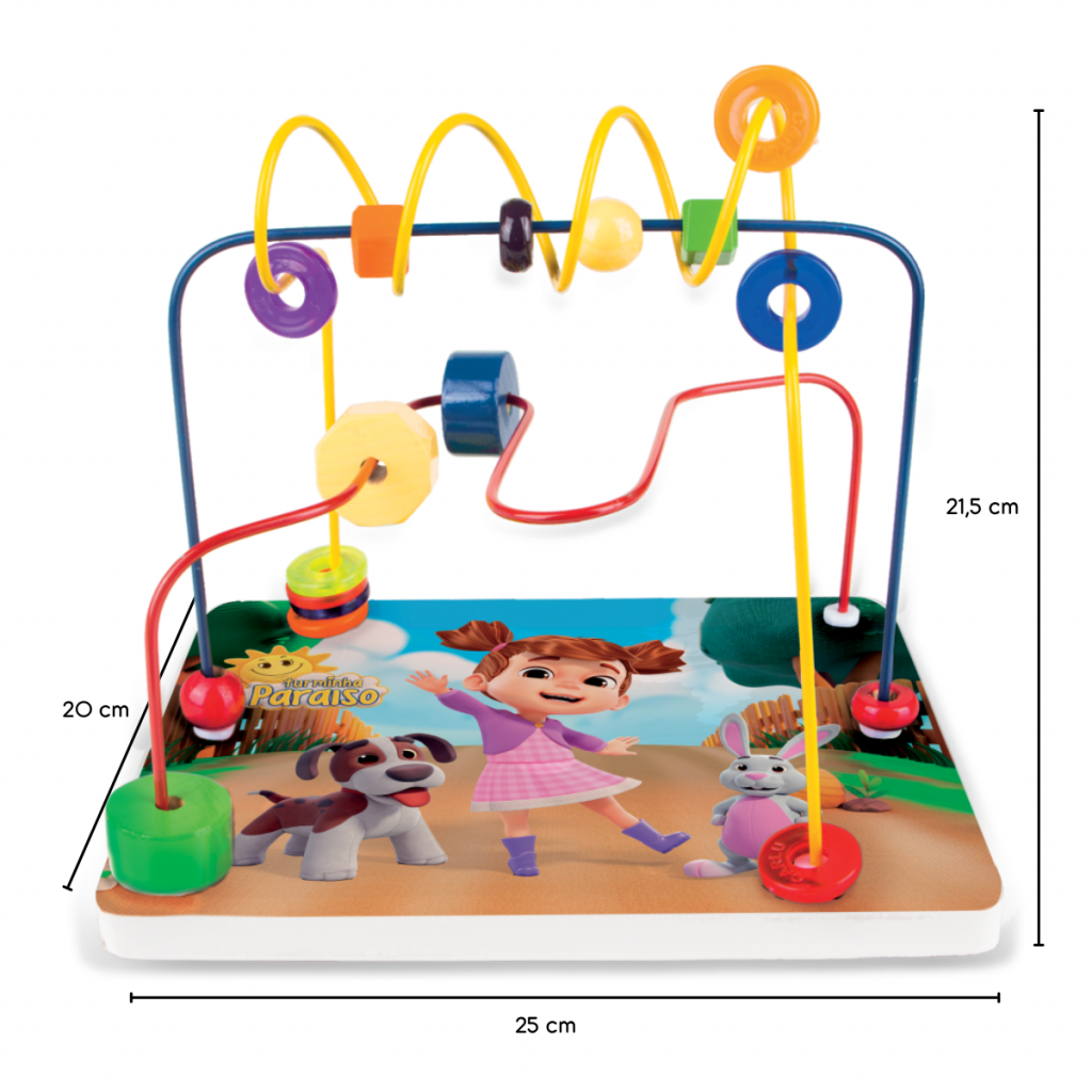 Descritivo Detalhado: Brinquedo confeccionado em madeira, M.D.F. e arame. Composto por 03 circuitos e 17 peças de formas variadas e coloridas. Arame resistente e pintado com tinta atóxica. Base serigrafada e ilustrada com tinta em policromia ultravioleta atóxica, peças pintadas com tinta atóxica colorida. Medida do produto: 25 x 20 x 21,5cm. Embalagem: Caixa de papel.