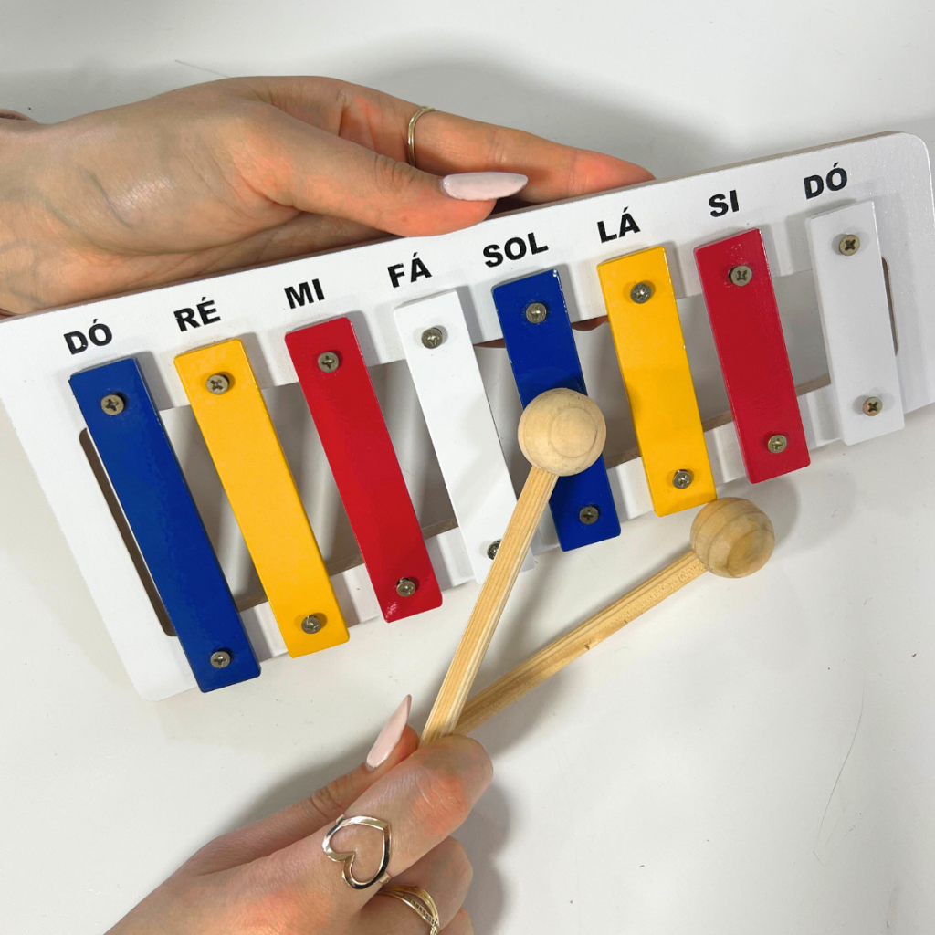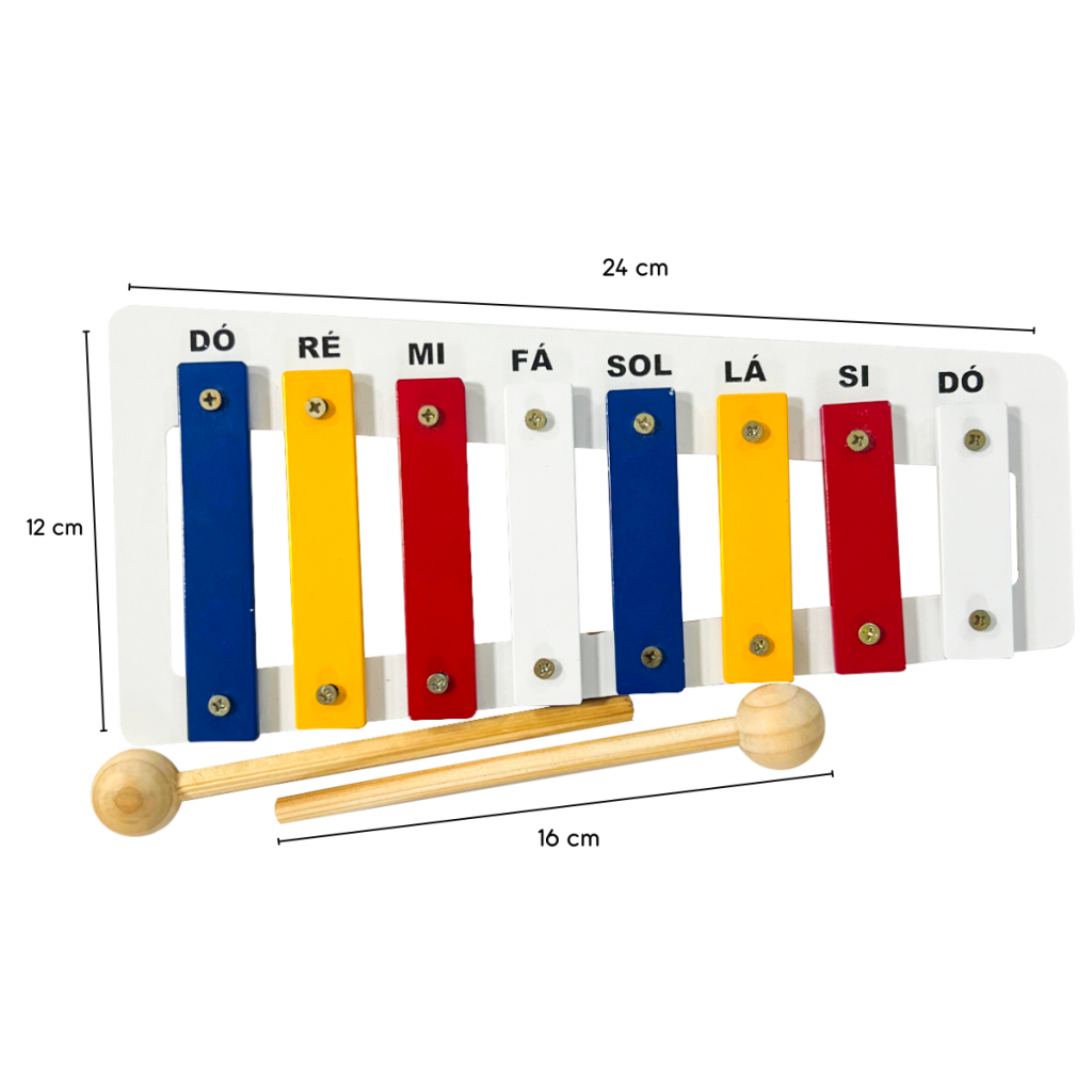 Descritivo Detalhado: Brinquedo que imita um instrumento musical, confeccionado em madeira, metal, E.V.A. e M.D.F. Composto por 8 barras sonoras em metal. Base pintada com tinta atóxica. Acompanha 2 baquetas de madeira medindo 16 cm. Metalofone medindo: 27 x 12 cm.