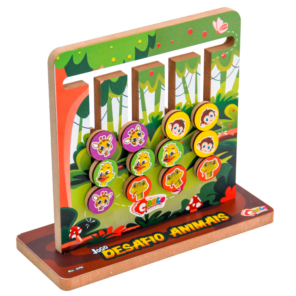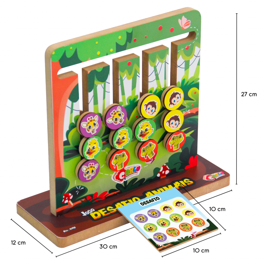 Material: M.D.F. colorido e ilustrado. Composto por 01 Base de 30 x 26 x 12 cm e 15 cartelas de 10 x 10 cm ilustradas os desafios da sequência.