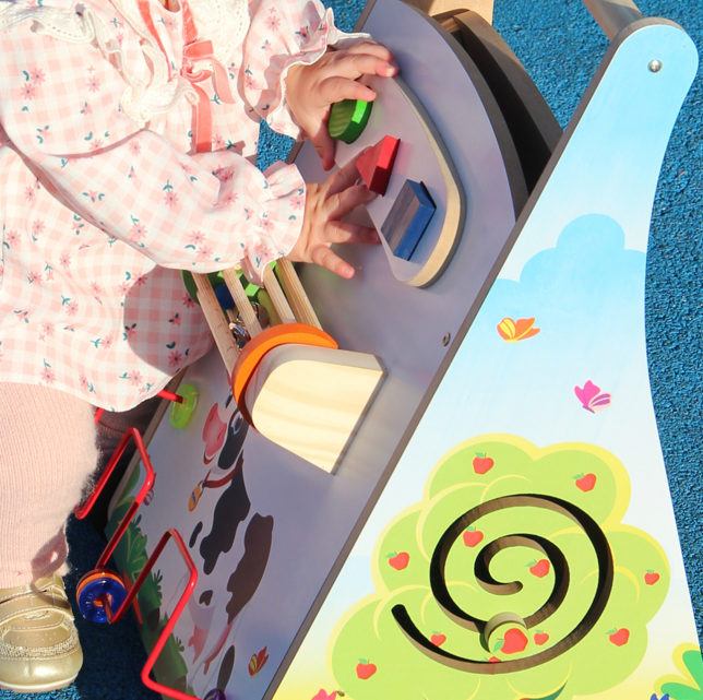 01 apoiador de 38 x 50 x 32 cm (larg. x alt. x prof.) Com suporte para apoio das mão, 04 rodinhas e 5 atividades: