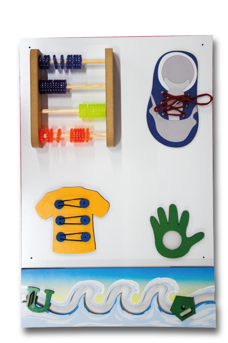 Atividades: Ábaco - mãozinha com textura em fibra siliconada- percurso com uma forma geométrica e a vogal “U” (forma geométrica para apoio de um lápis grafite ou de cor) – Alinhavos Tênis (acompanha 01 cadarço de aproximadamente 70 cm), Camisa com botões fixos e elástico.