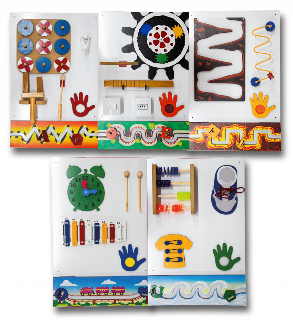 Atividades: Tomada - interruptor - mãozinha com textura em lixa - percurso com uma forma geométrica e a vogal “E” (forma geométrica para apoio de um lápis grafite ou de cor) – reco-reco madeira.