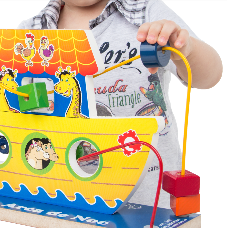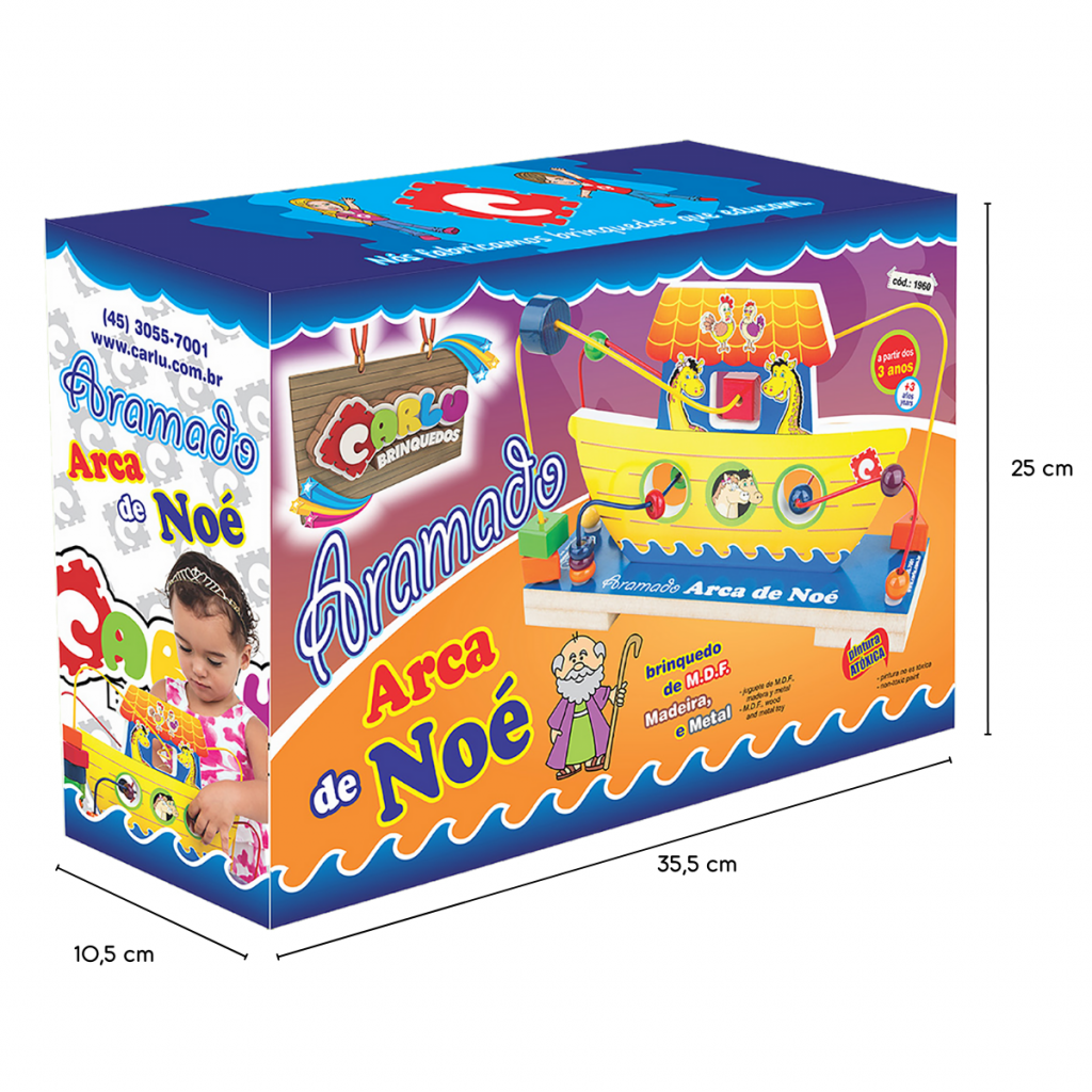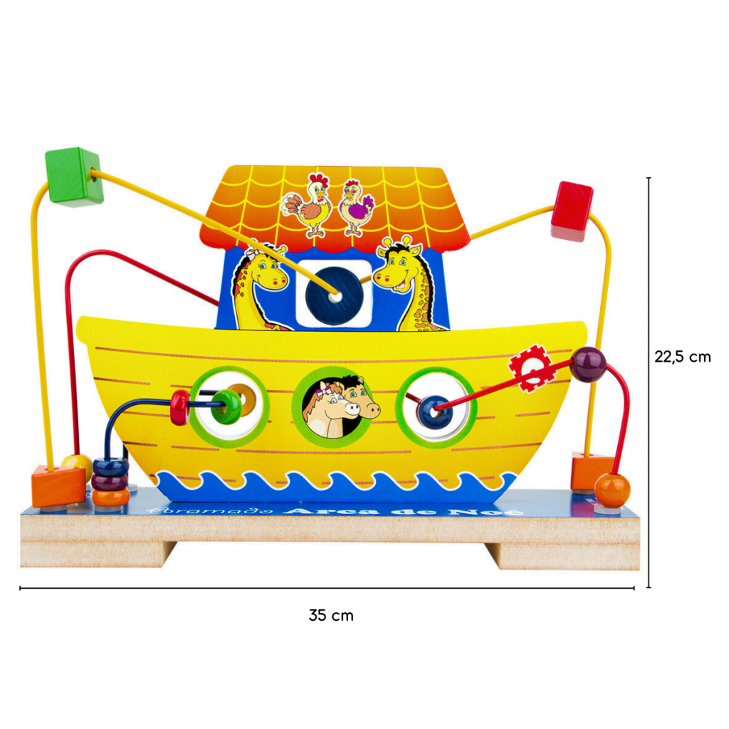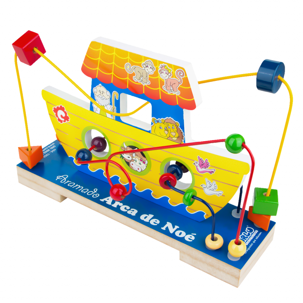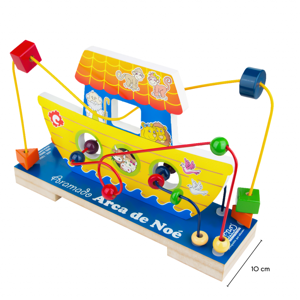 Brinquedo confeccionado em madeira, M.D.F. e arame. Composto por 03 circuitos e peças de formas variadas e coloridas. Arame resistente e pintado com tinta atóxica. Base e peças pintadas com tinta atóxica colorida e uma Arca ao centro com janelas vazadas por onde passam os circuitos, toda serigrafada e ilustrada com tinta em policromia ultravioleta atóxica, Medida do produto: 35 x 10 x 22,5 cm. Embalagem: Caixa de papel microondulado ilustrado medindo 35,5 x 10,5 x 25 cm. Lacrada com película de P.V.C. encolhível.