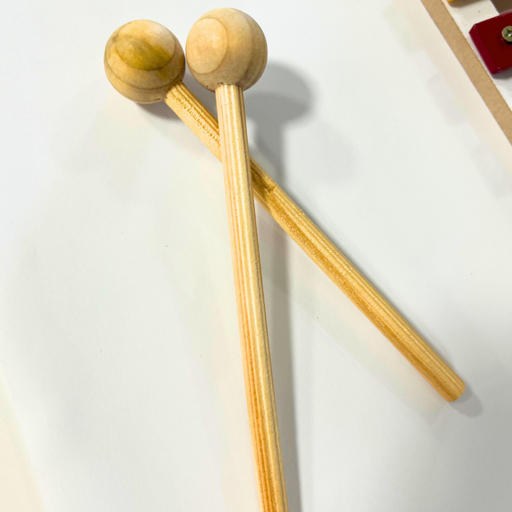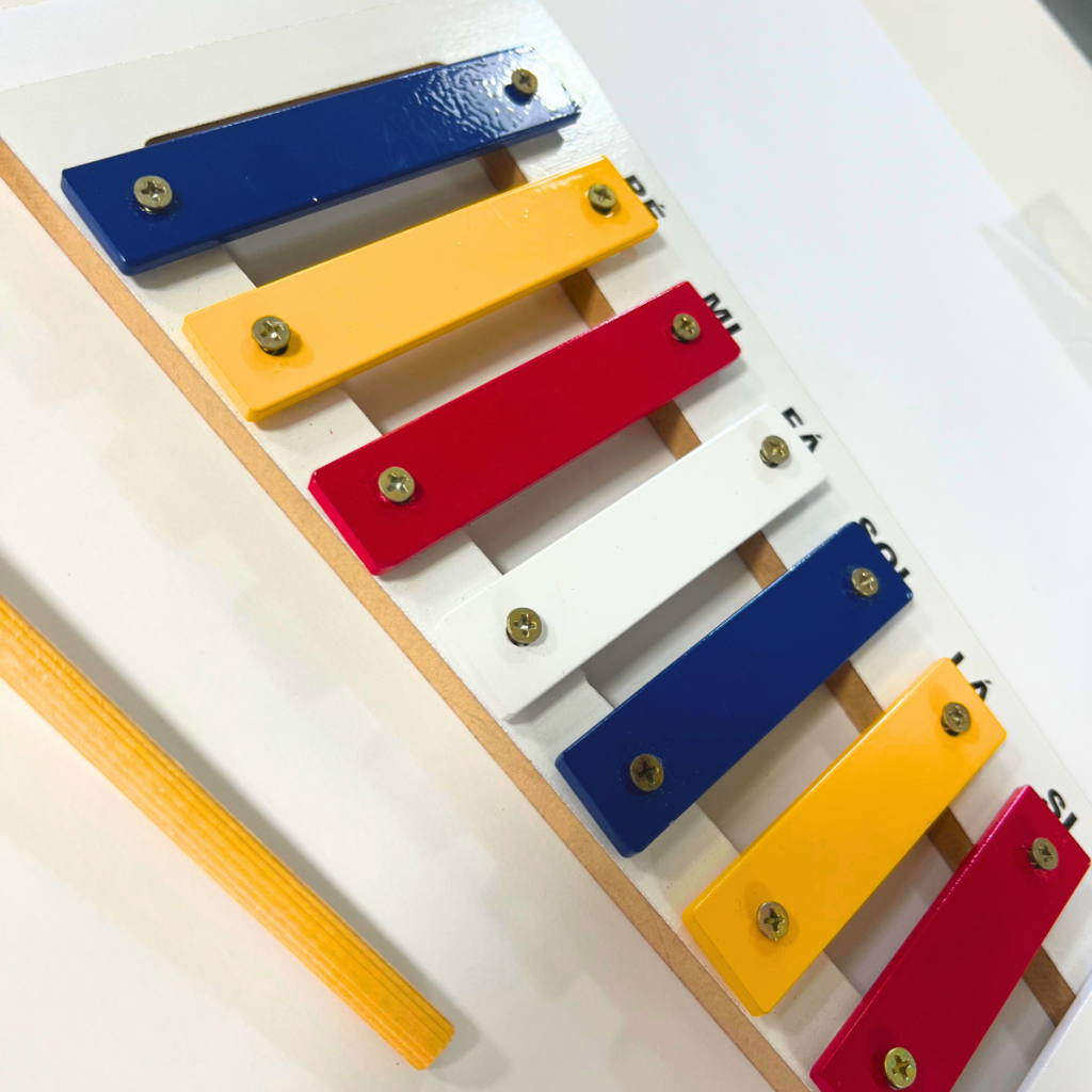 Descritivo Detalhado: Brinquedo que imita um instrumento musical, confeccionado em madeira, metal, E.V.A. e M.D.F. Composto por 8 barras sonoras em metal. Base pintada com tinta atóxica. Acompanha 2 baquetas de madeira medindo 16 cm. Metalofone medindo: 27 x 12 cm.
