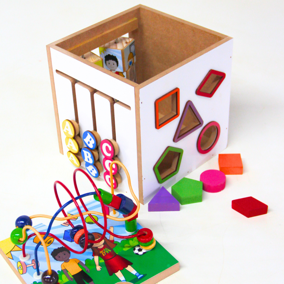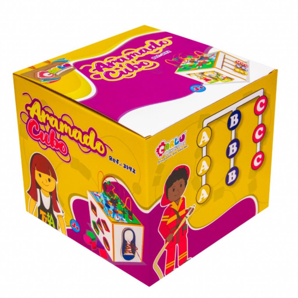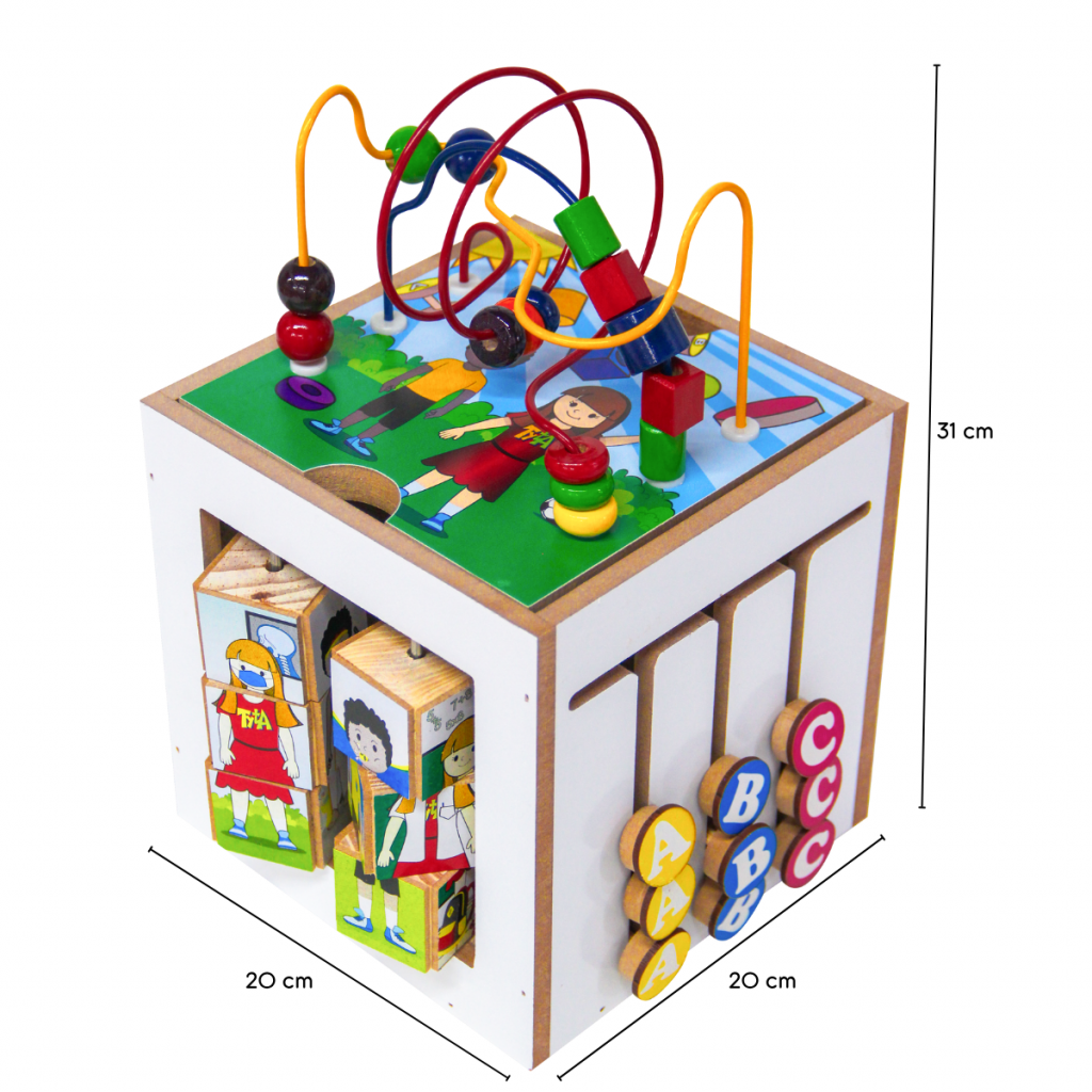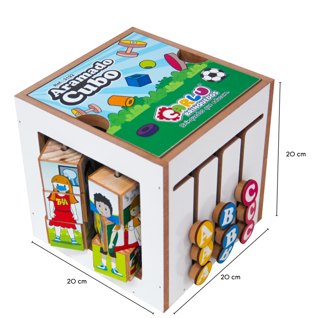 Descritivo Detalhado: Brinquedo confeccionado em madeira, M.D.F. Plástico PP, poliéster e arame. Composto por 05 atividades variadas e coloridas(laterais com atividades: passa forma geométrica, troque e encaixe os personagens, arrume as sequências, alinhave o tênis, e superior 01 aramado colorido) . Medida cubo fechado: 22 x 21,5 x 20 cm. Medida Cubo montado: 22 x 34,5 x 21 cm. Embalagem: Película de P.V.C. encolhível.