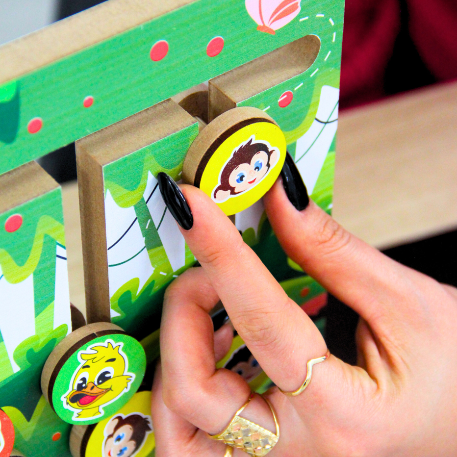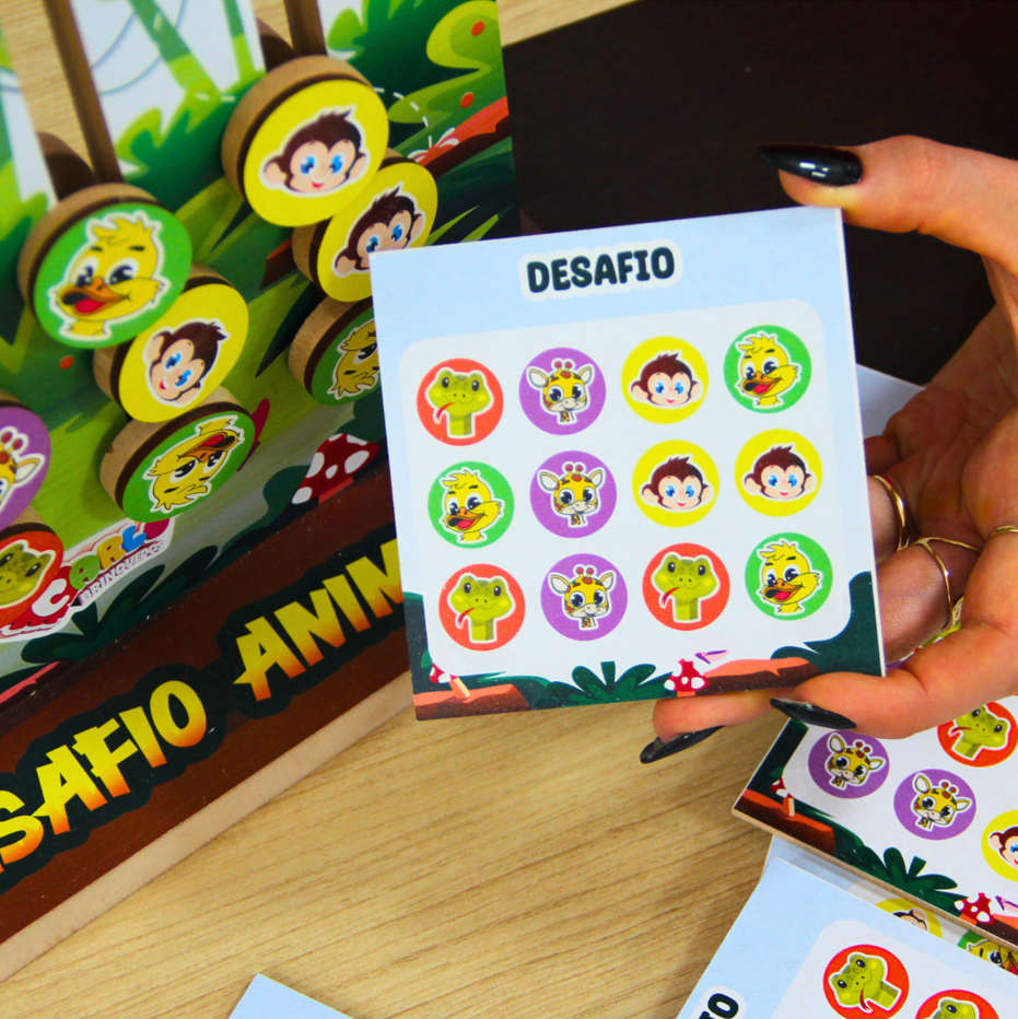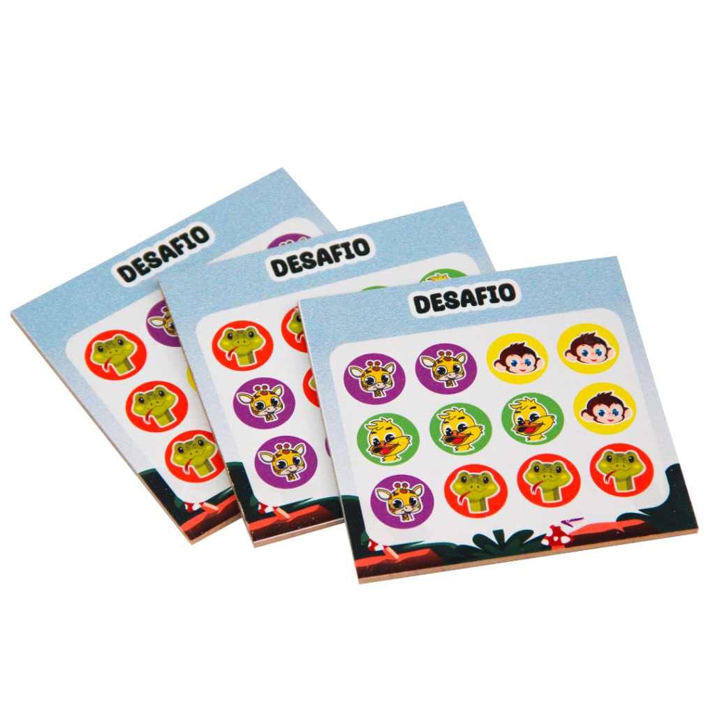 Material: M.D.F. colorido e ilustrado. Composto por 01 Base de 30 x 26 x 12 cm e 15 cartelas de 10 x 10 cm ilustradas os desafios da sequência.