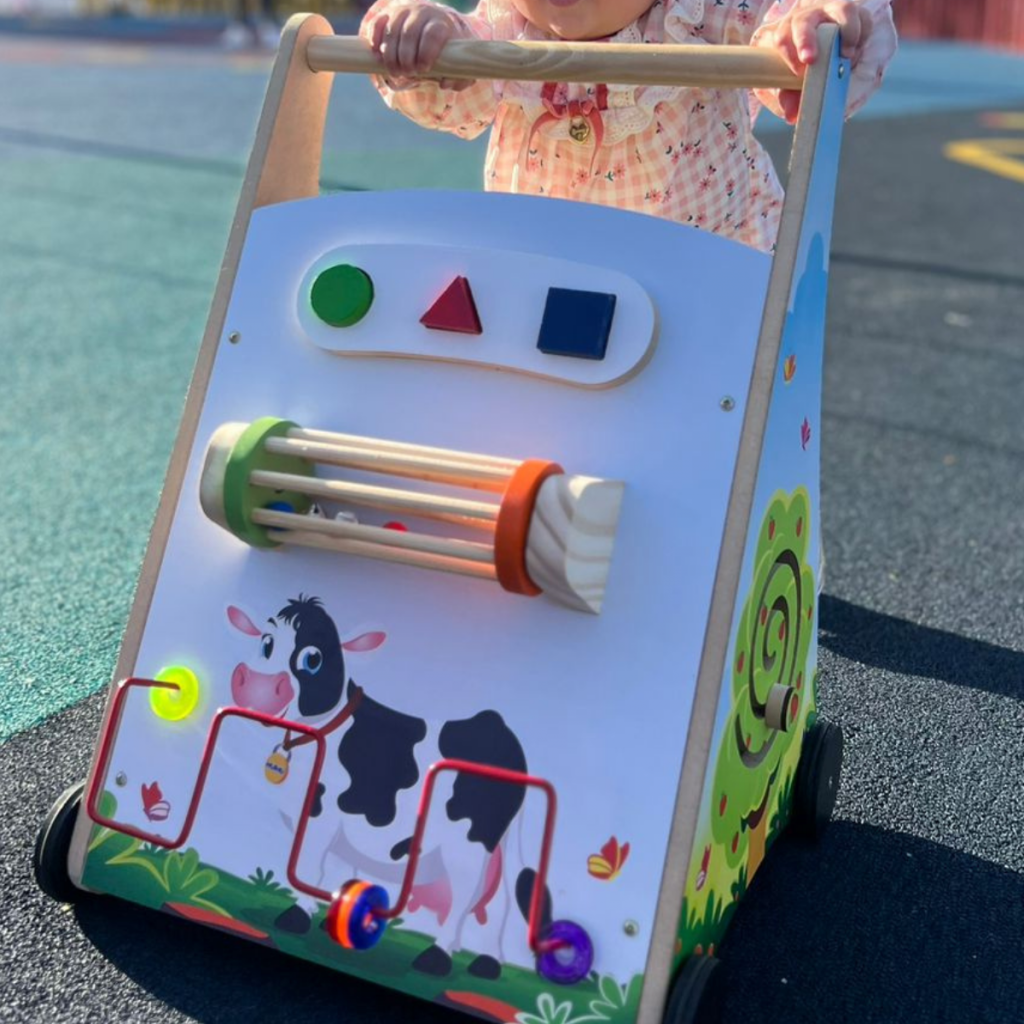 Objetivo: Auxiliar na locomoção dos primeiros passinhos com mais segurança e liberdade, ajudar a desenvolver o equilíbrio, desenvolver o cognitivo, a coordenação visomotora, identificar cores, formas.