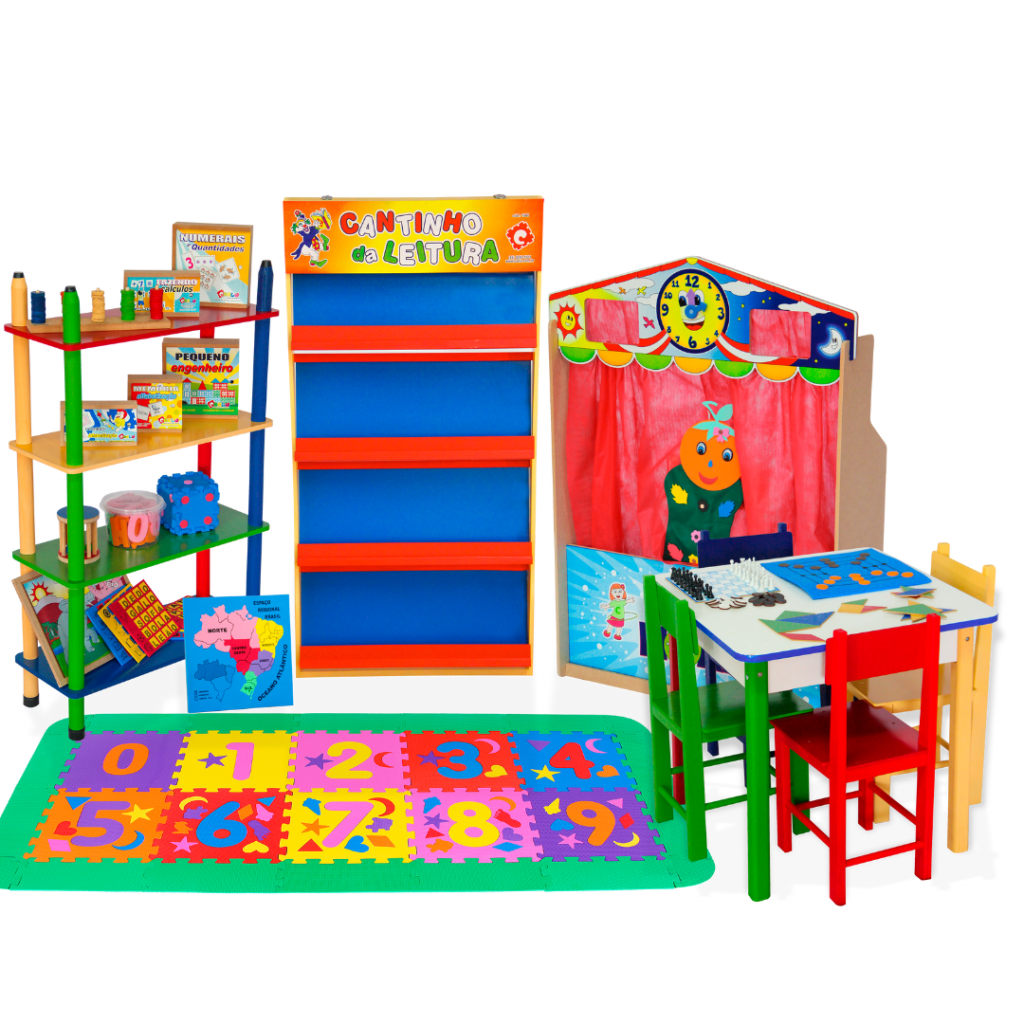 Descritivo detalhado: Brinquedoteca composta por 21 ítens: Teatro da hora, Mesa com 4 cadeiras, Pequeno engenheiro, Cantinho da leitura, tapete numerais com bordas, Prateleira colorida, Mapa, Fantoche avulso, Tangram, Memória, Dominó, Quebra-cabeça, Dado pequeno, Loto leitura, Numerais e quantidades, Fazendo cálculos, Jogo de xadrez e dama, Alfabeto móvel, Jogo de trilha, Ábaco aberto e Rola rola mini. Embalagem: Caixa de papelão