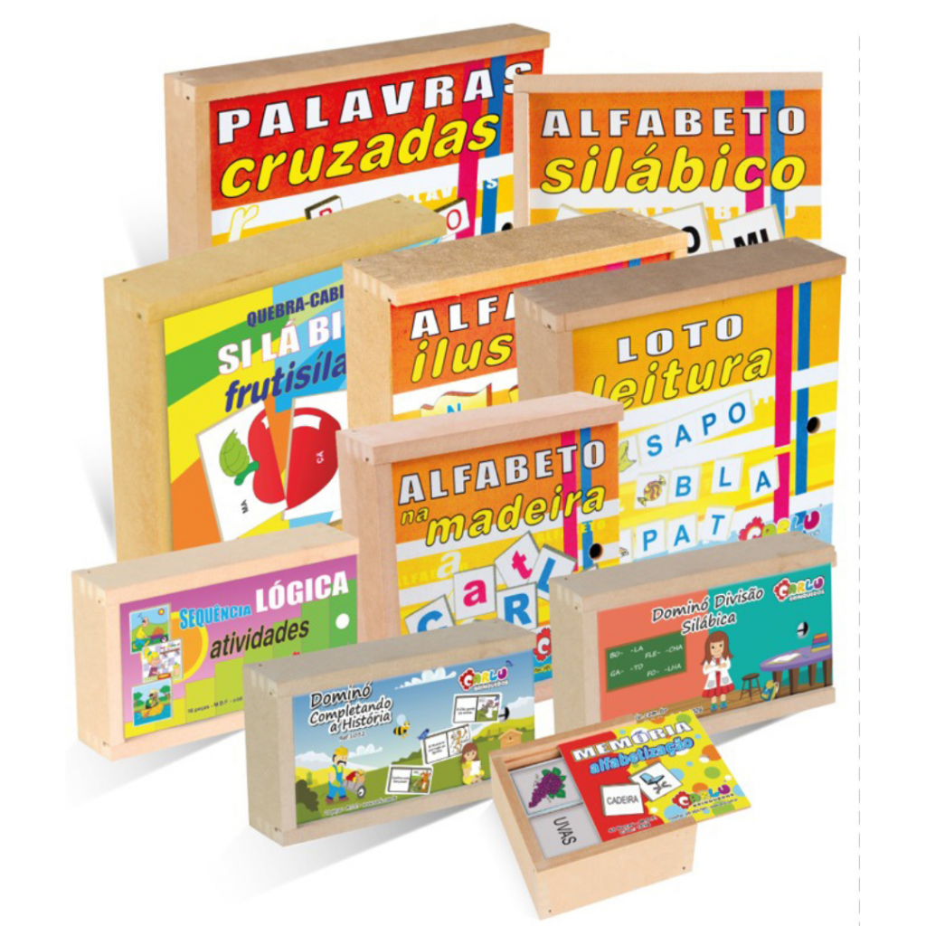 Descritivo detalhado: Conjunto composto por 10 brinquedos: Alfabeto silábico, Loto leitura, Quebra cabeça-silábico, Alfabeto ilustrado, Dominó completando a história, Sequência lógica, Dominó divisão silábica, Memória alfabetização, Alfabeto na madeira e Palavras cruzadas. Acondicionados em maleta de M.D.F. medindo 43 x 27 x 23 cm, com tampa serigrafada 2 alças de sisal e tranca cadeado. Embalagem: Papelão.