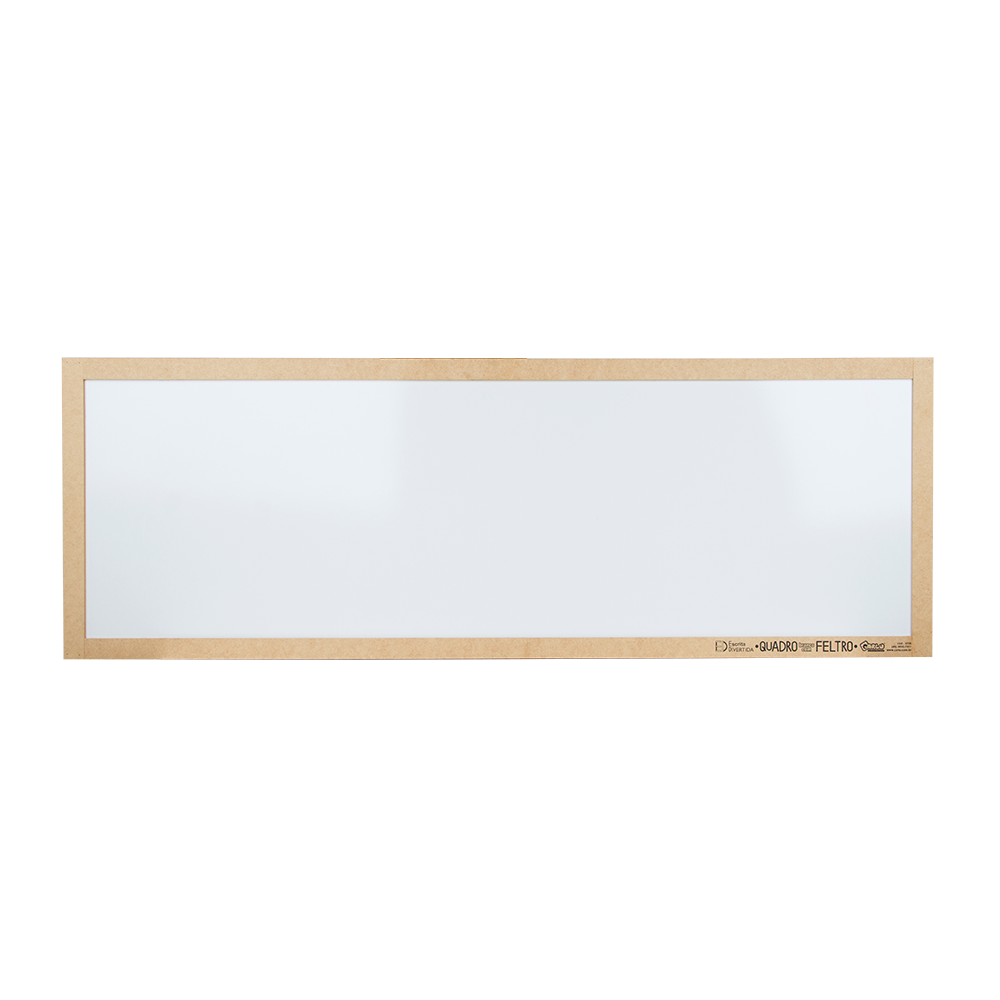 Descritivo detalhado: Quadro branco com feltro Confeccionado em M.D.F. especial e feltro. Quadro branco em uma das faces e na outra face com feltro (para fixar as formas do Kit com velcro) e com borda. Medida do quadro: 50 x 150 cm. Embalgem: Papelão. Obs.: O kit Velcro não acompanha o produto.